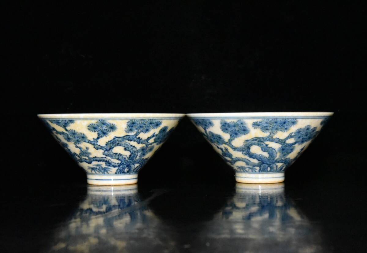 - 蔵友旧蔵出 明 成化年製款 紅胎 青花 鬆竹梅紋 斗笠杯一對 稀少珍品 貴重品 古陶瓷品 置物 古賞物 中国古玩 中国古美術品