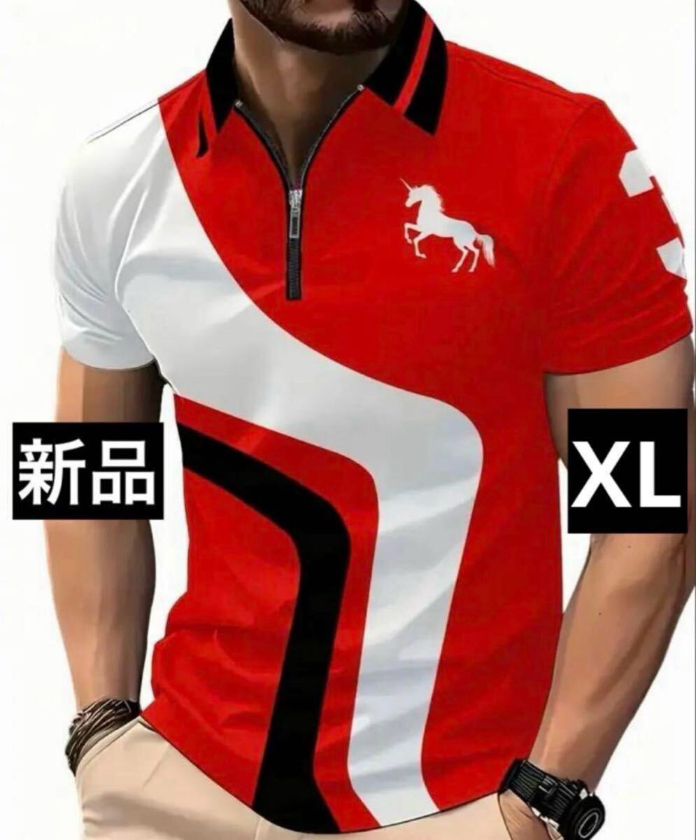 - 【新品/XLサイズ】ゴルフウェア メンズ 半袖 ポロシャツ ハーフジップ 赤白