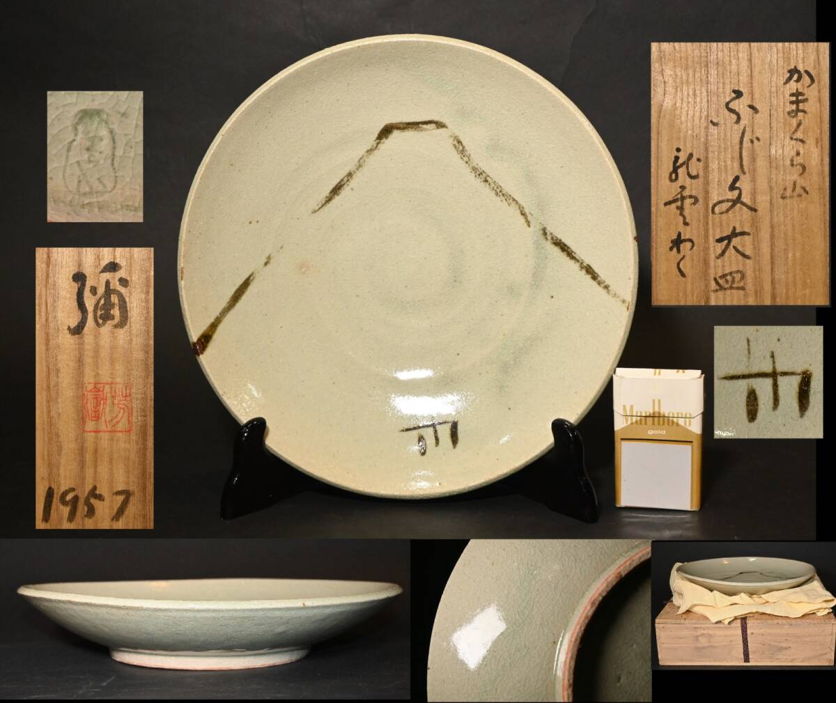 > 真作■平凡社創業者 下中彌三郎■ かまくら山焼 ふじ文大皿 1957年 共箱 径約30.8cm 教員組合の創始者 兵庫県多紀郡生 富士山 検:魯山人