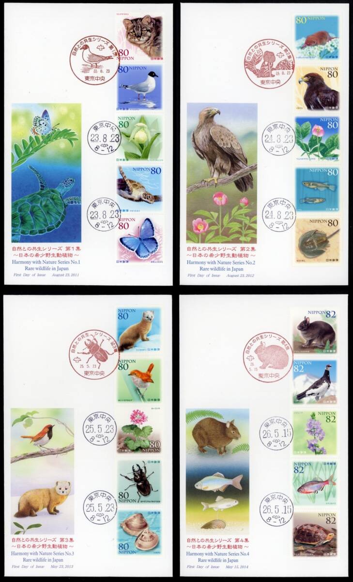 > z153 【FDC】自然との共生シリーズ「日本の希少野生動植物」第1集〜第4集[東京中央/23.8.23・24.8.23・25.5.23・26.5.15/JPS]