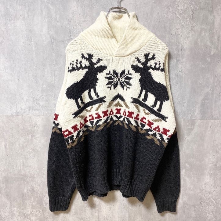 - 古着 used 長袖ノルディック柄カウチンニット セーター ハイネック レトロデザイン トナカイ 鹿 白 黒 秋冬服