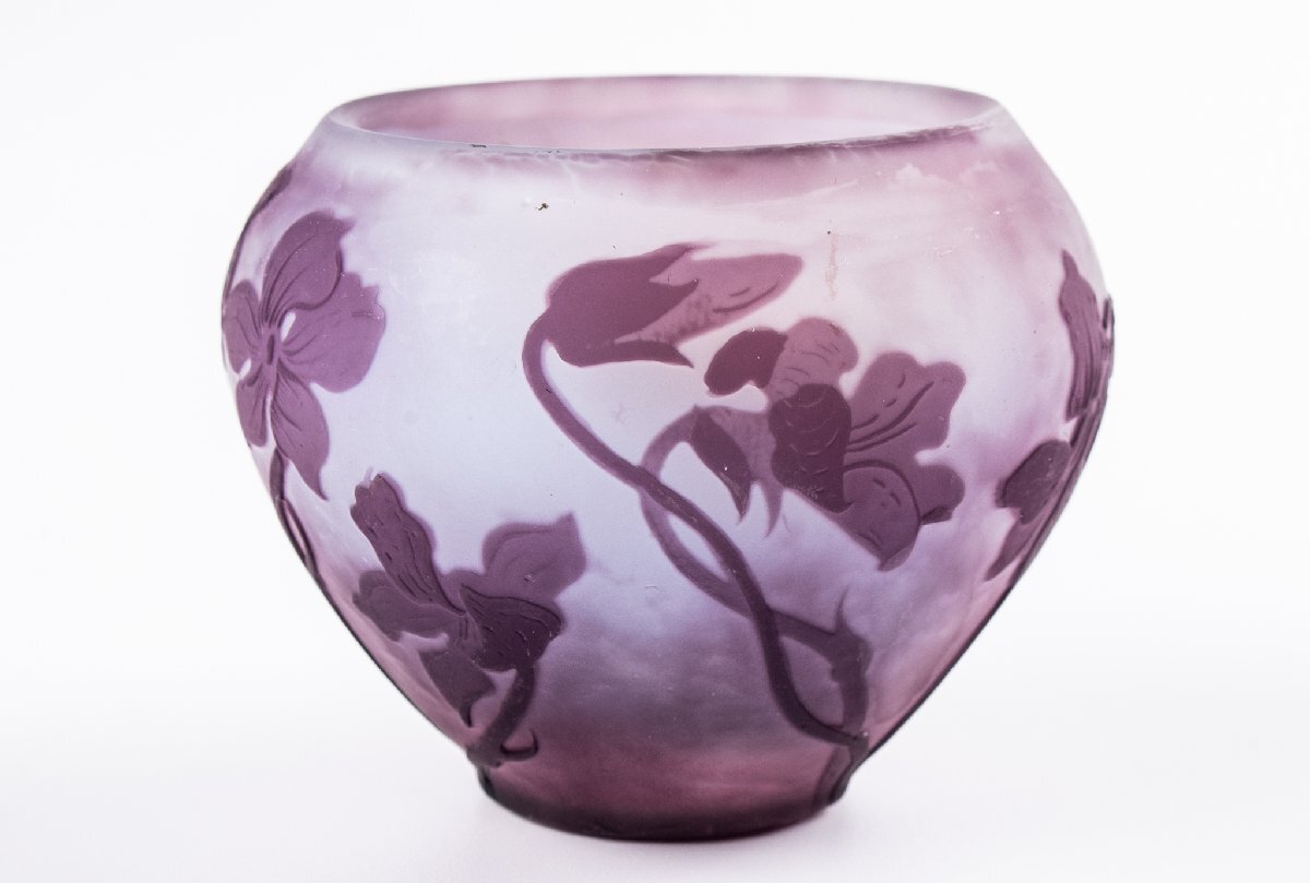 - 【西洋美術】 アンティーク エミールガレ 草花模様茶入れ 被せ硝子カメオ彫刻 本物保証 E2191 アート インテリア デザイン