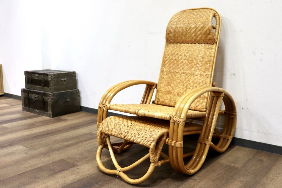 - GMIK316○ラタンリクライニングチェア 三ツ折寝椅子 ハイバック 足置き付 籐 アジアンテイスト レトロ