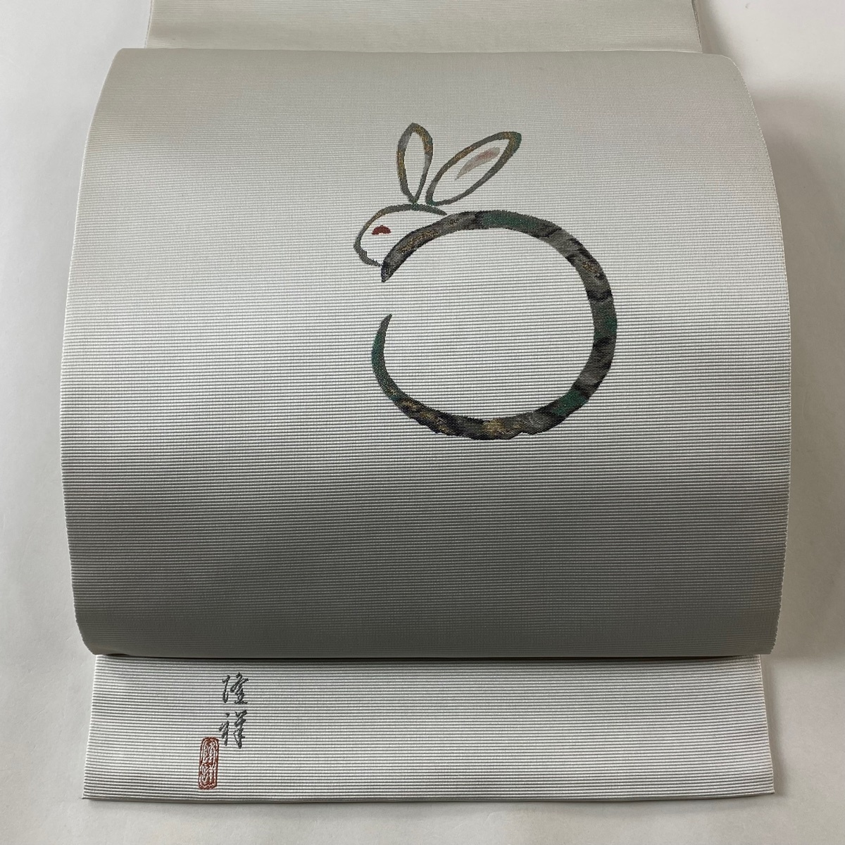 > 袋帯 秀品 落款 うさぎ 金糸 灰色 お太鼓柄 正絹 【中古】