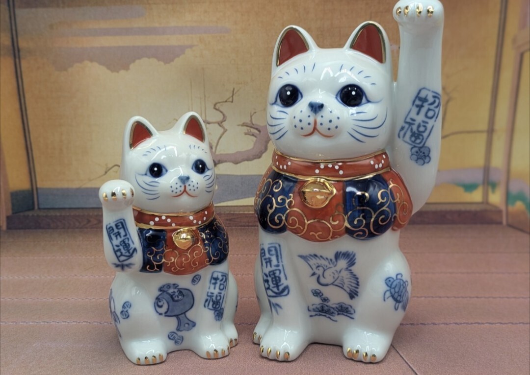 - 招き猫 縁起物 染錦開運招福招き猫 手長左手上げ 4.5号 右手上げ 3.5号 2体セット 置物