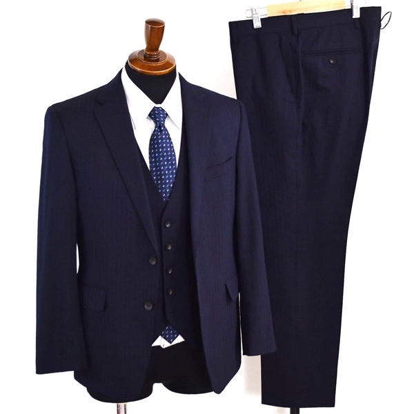 ・春夏秋対応。ベスト付き。2つボタンシングル。袖口4つ釦開き見せ。背抜き。センターベント。フラップポケット。ネーム刺繍なし。