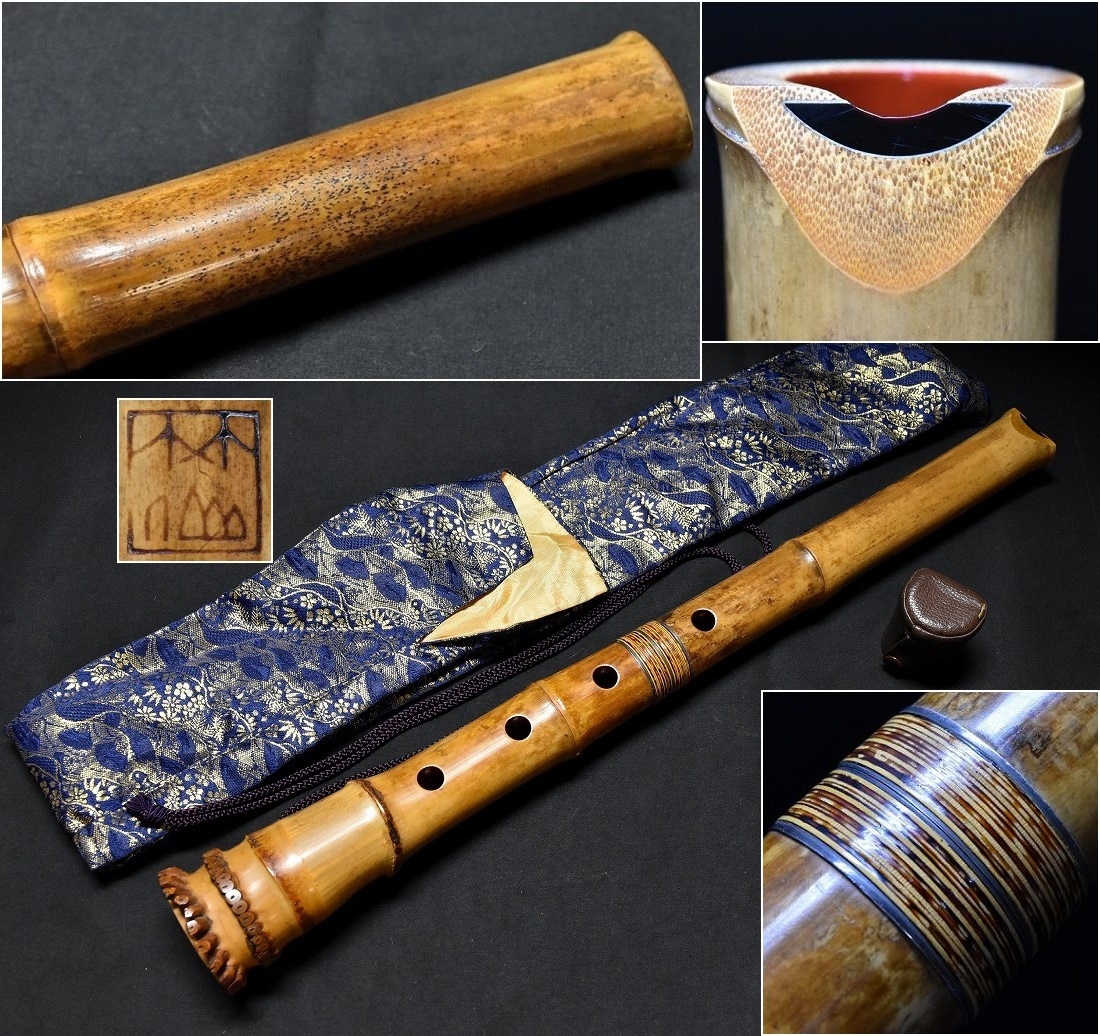 - 都山流尺八 胡麻竹 銀縁歌口【玉井竹仙】銀三線籐巻2つ折 1尺6寸管 袋・キャップ付 時代和楽器