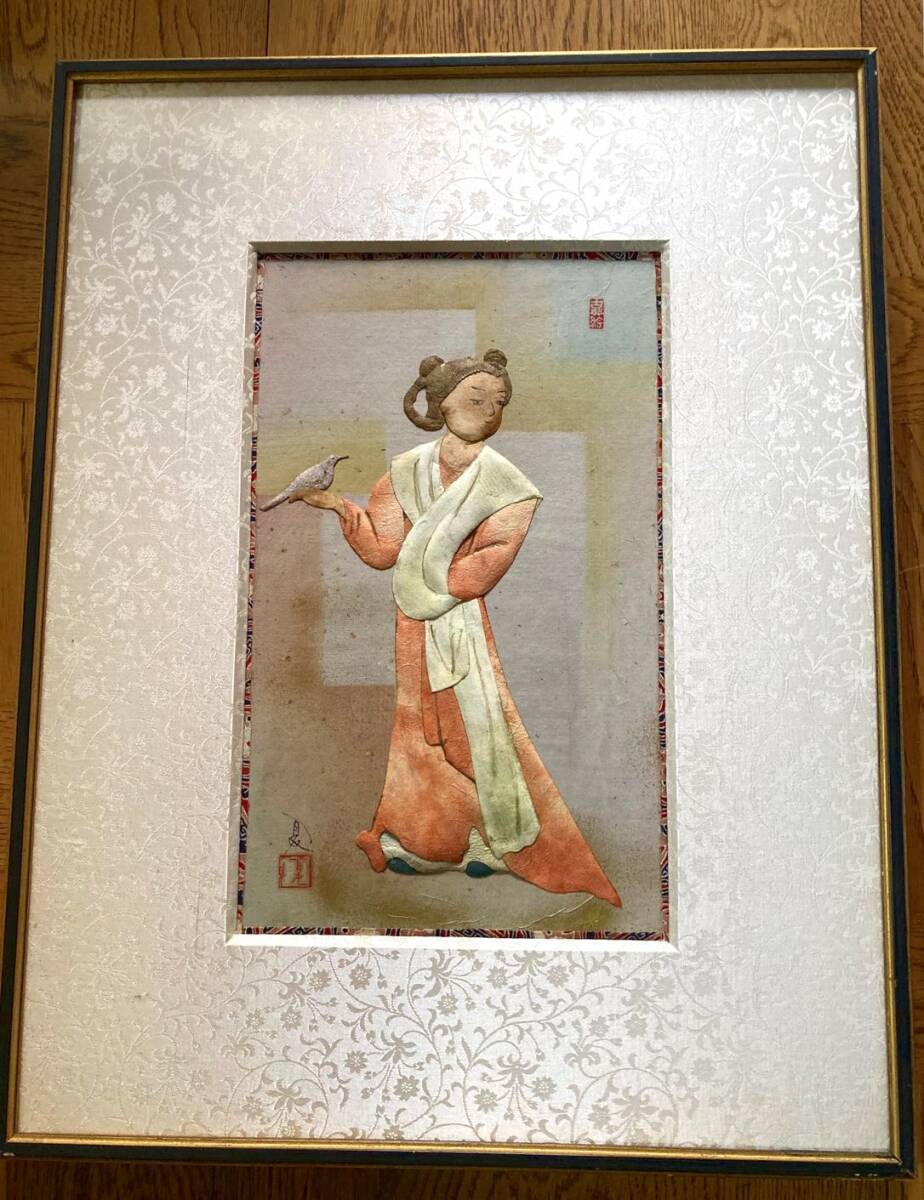 - 古代壁画女人像 1982年貼り絵細工 荒川夏子「真作」 古典絵 絵画 金彩