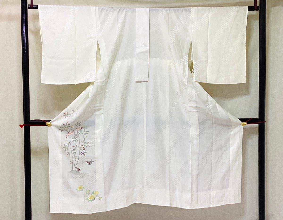 > 中古品 正絹 長襦袢 三つ鱗 紋綸子 友禅銀彩加工 バチ衿 半衿付き 衣紋抜き付 24477