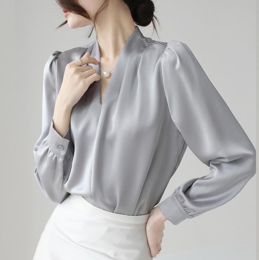 - 人気推薦/上品 Vネック 長袖 ブラウス レディース サテン シャツ オフィス きれいめ おしゃれ 大人 ビジネス デート 光沢感 /グレー