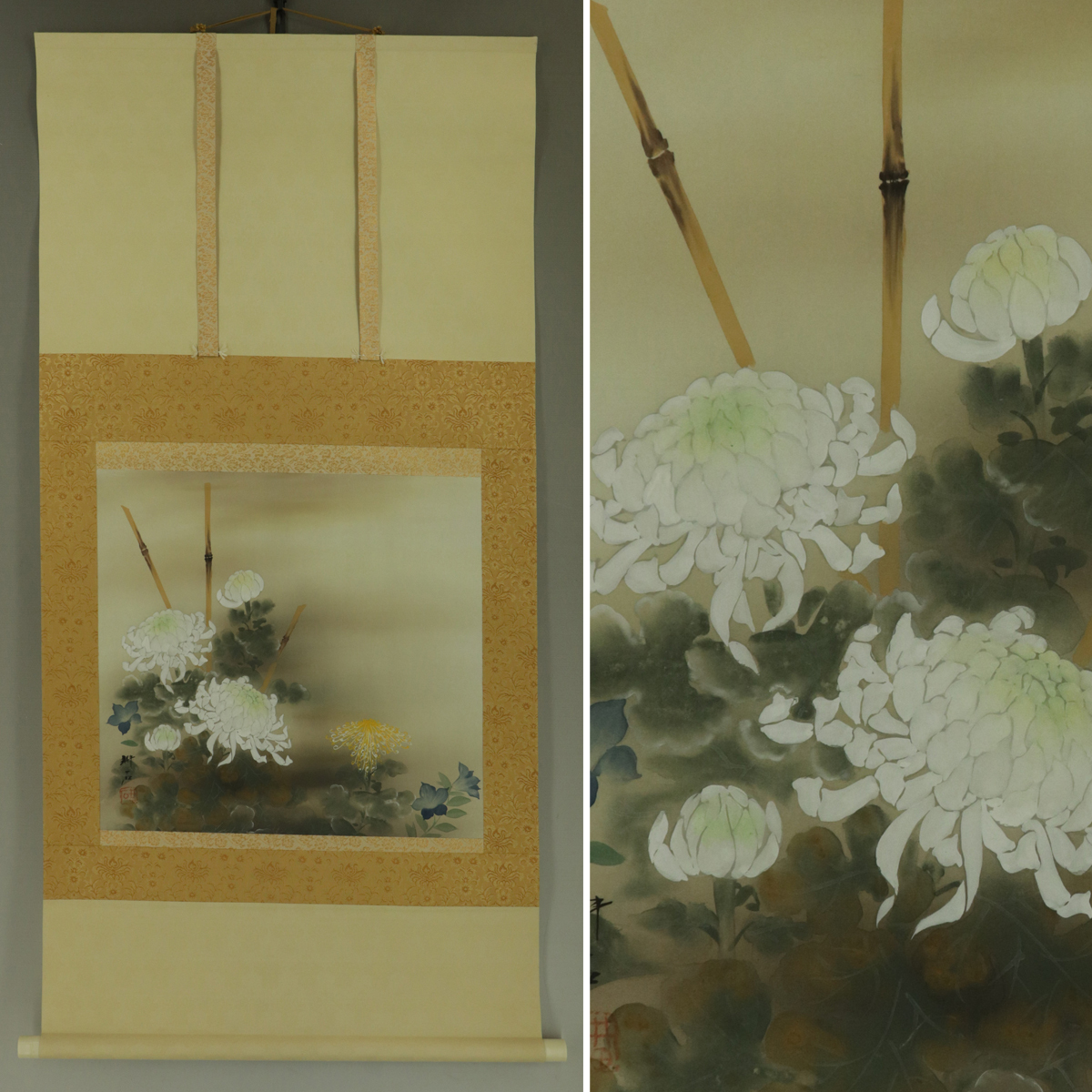 - 【肉筆】耕石銘【菊】◆絹本◆掛軸 s05052a