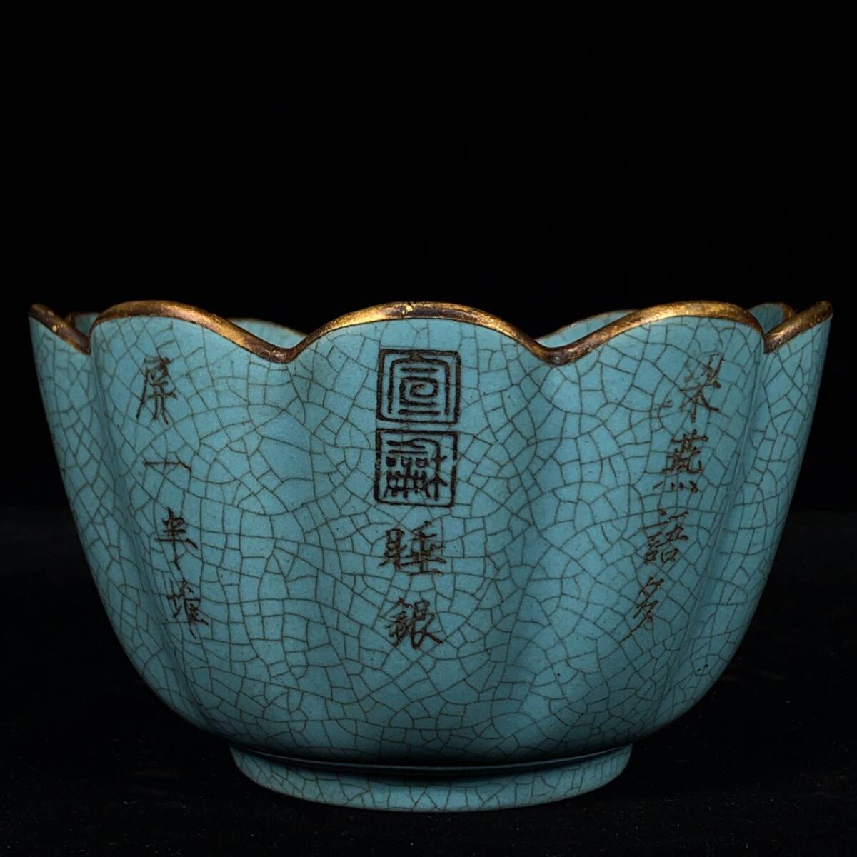 > 蔵友旧蔵出 宋 汝窯 冰裂紋 包口 銘文 蓮花供碗 稀少珍品 貴重品 古陶瓷品 置物 古賞物 中国古玩 中国古美術品