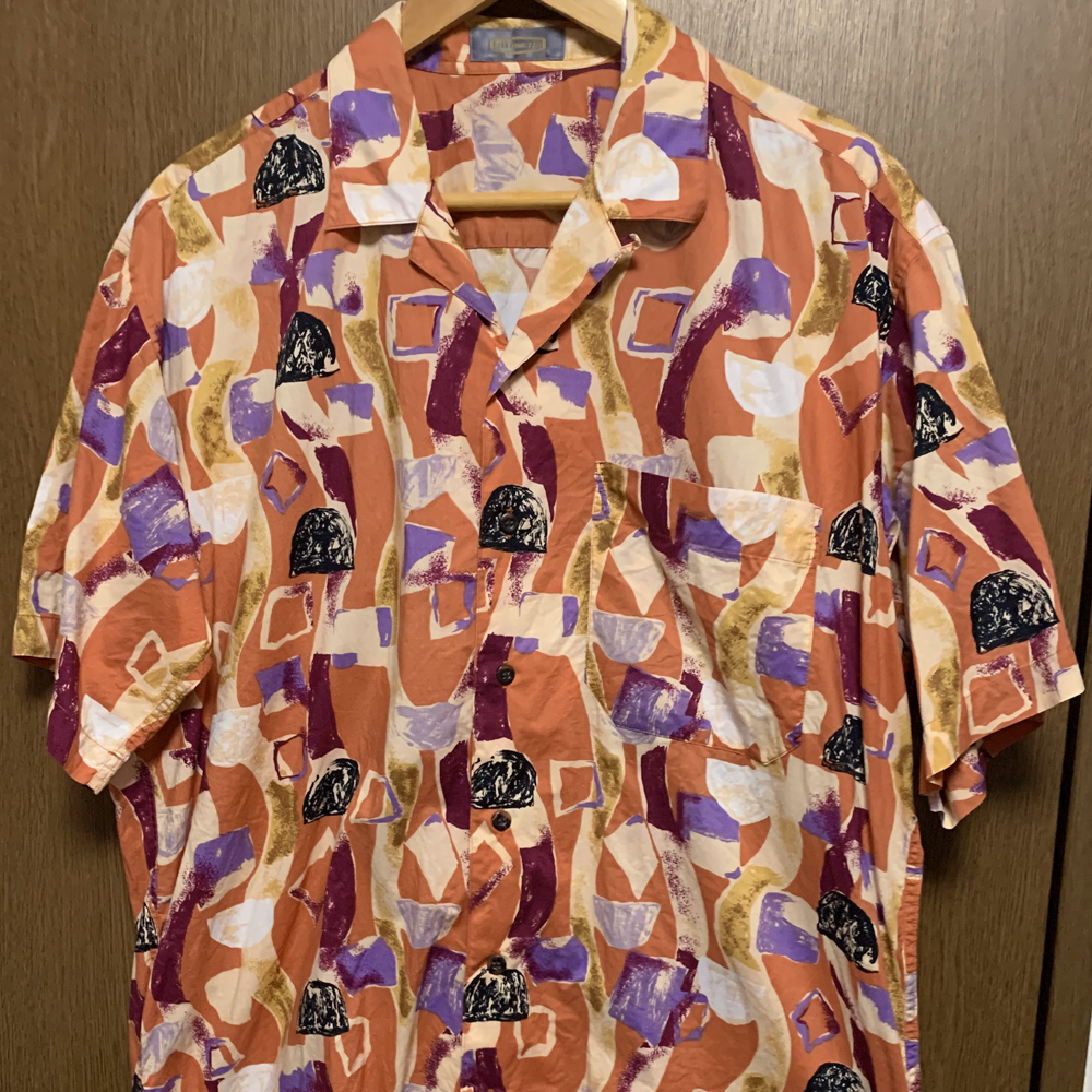 - L【INTERMEZZO|半袖シャツ】インターメッツォ オレンジ系 総柄 オープンカラー 開襟 アロハ XL