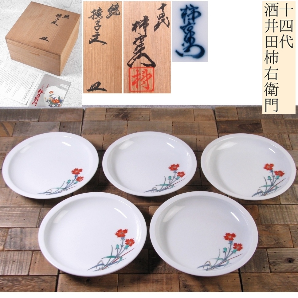> 十四代酒井田柿右衛門 錦 撫子文皿5枚 幅:15.3cm 共箱・栞付 極美品/25g046