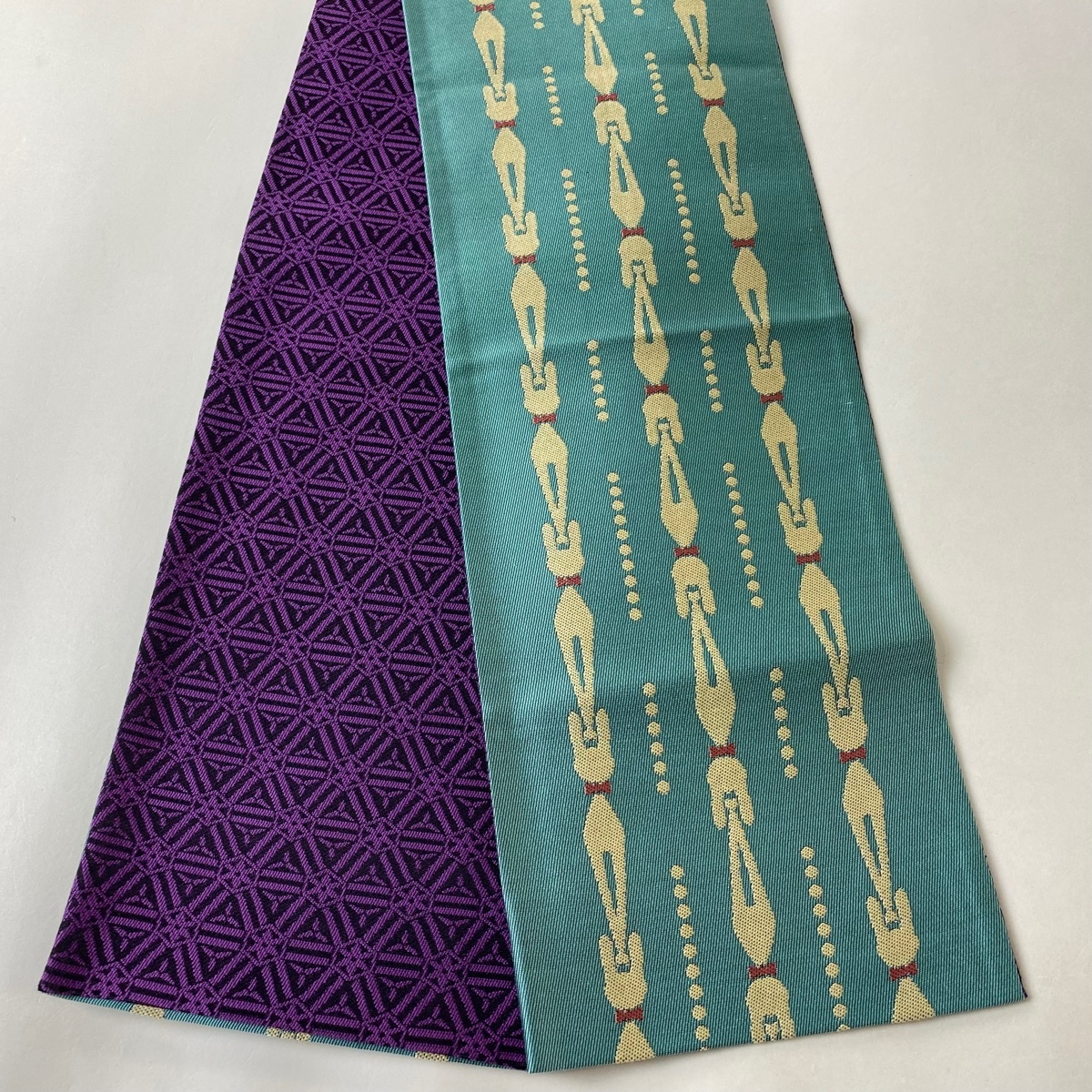 - 半幅帯 名品 想屋 うさぎ 幾何学 青緑 正絹 【中古】