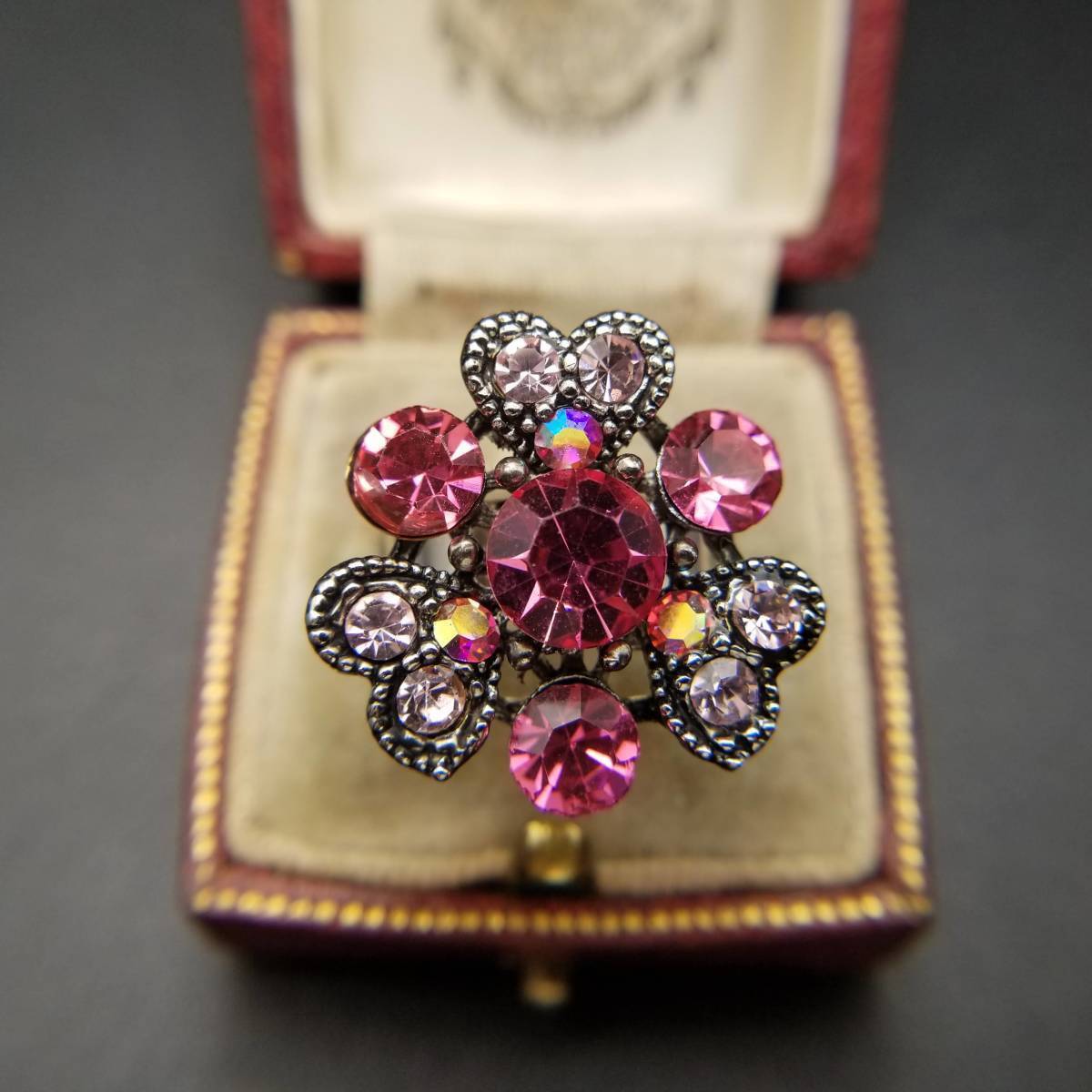 - ピンクのハート 花モチーフ ヴィンテージ フラワー リング シルバートーン 指輪 ファッションジュエリー レトロ キュート Y20-A