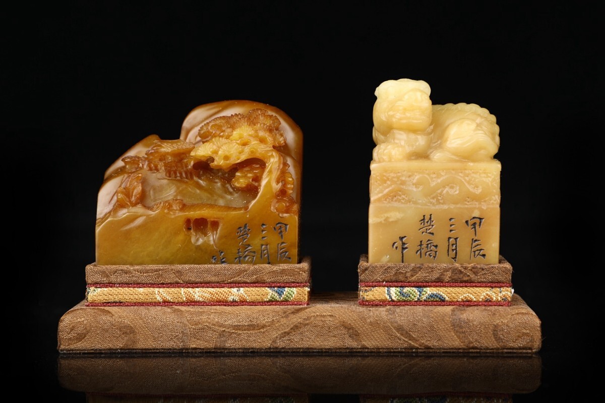 - 「清 楚橋作 老寿山石 田黄石彫り 山子獣鈕套章」極細工 擺件 古賞物 中国古美術 旧蔵出
