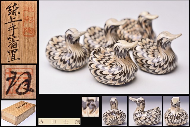 > 赤田士朗 ★ 練上手 箸置 ★ 共箱 栞 ★ アヒル ★ 5個セット ★ 堆彩陶「土の織物」★ 独特な風合と模様で多くの人を魅了 ★ 可愛らしい姿