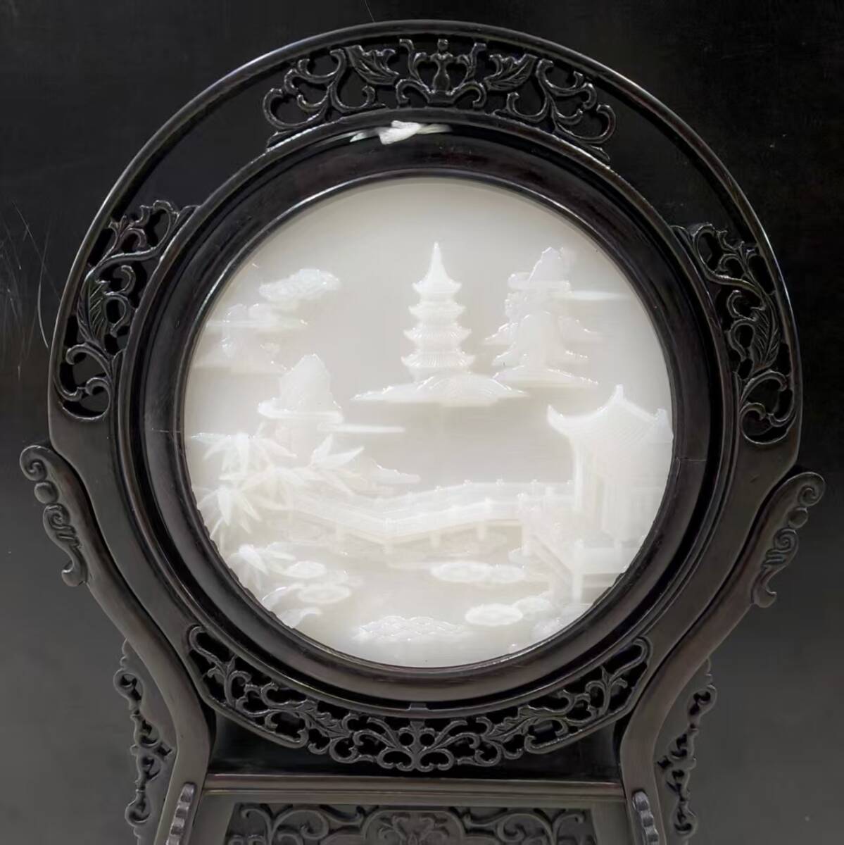 - 古木彫り 秘藏 清代 古烏木白玉転心屏風(唐詩山水図・寒天楼玉宇) 書道具 文房具 時代物 古美術 細密彫 置物 賞物 唐物 木彫り 文玩 8.14
