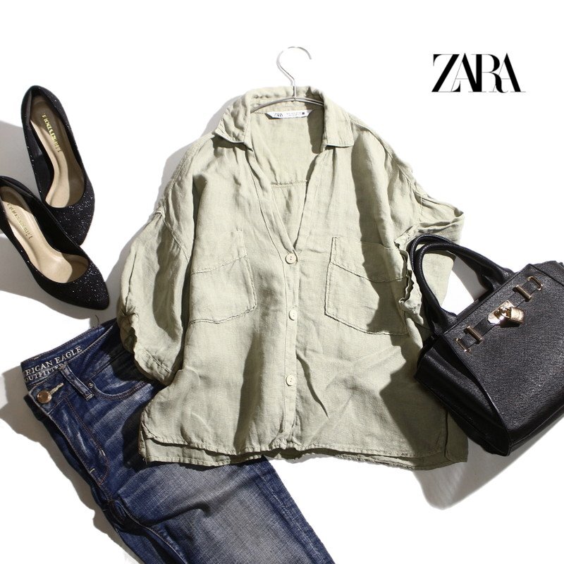 > 美品 ZARA ザラ 夏 オーガンジー 涼し気 麻100% ゆったり ドロップショルダー 半袖 シャツ M カーキ 淡い グリーン 緑 リネン シャツ 無地
