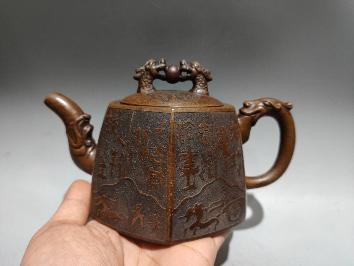 > 友人旧蔵 古原鉱古銅砂製 二龍戯珠壺 顧景舟款 紫砂壺 精品壺 急須 煎茶道具 茶道具 時代物 古董品 骨董 旧家藏出 唐物 中国古玩 古美術品