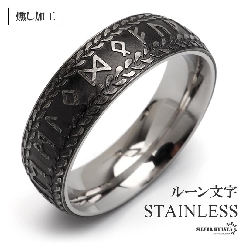 - (26号) ステンレス アンティークリング ルーン文字 メンズリング ケルトリング ブラック 燻し 模様 男性 金アレ対応