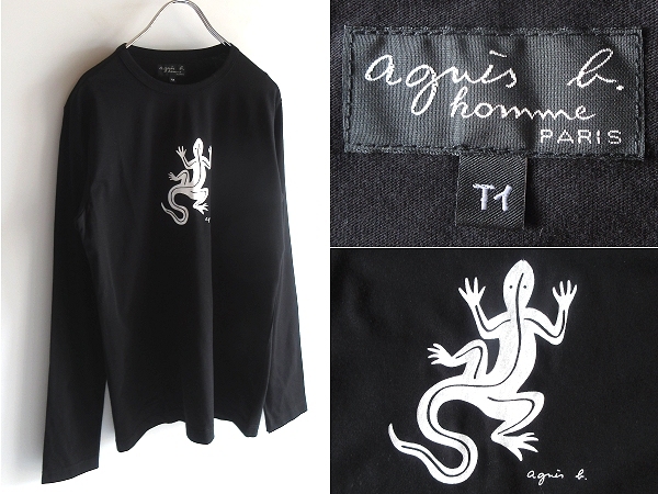 > 美品 agnes b. homme アニエスベーオム トカゲ/レザール/ロゴプリント カットソー ロンT 長袖Tシャツ T1 黒 ブラック 日本製 ネコポス対応