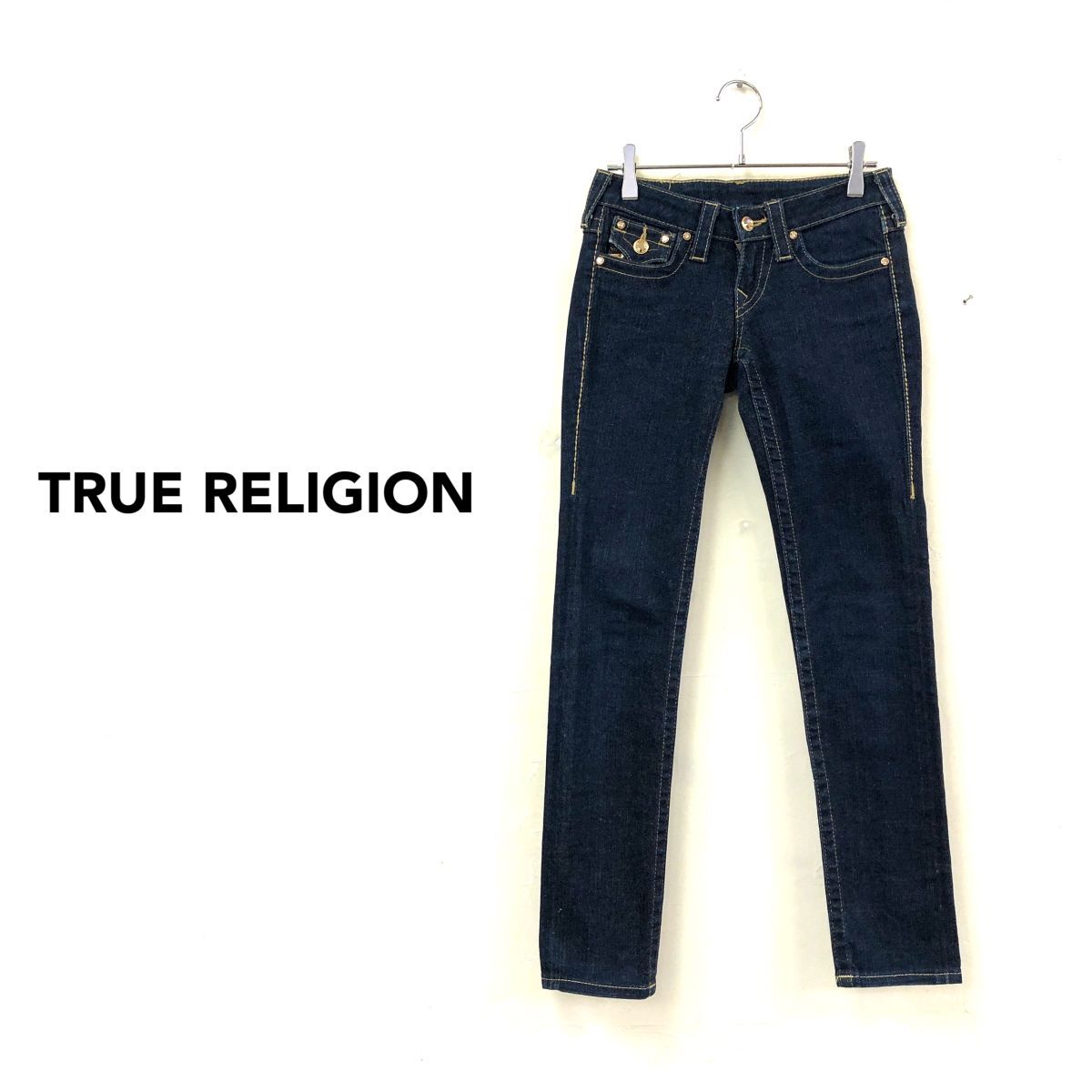 > 2H2108-G◆美品◆ TRUE RELIGION トゥルーレリジョン USA製 スキニーデニム ビジュー ストレッチ フラップ スパンコール ◆ size24 紺 綿