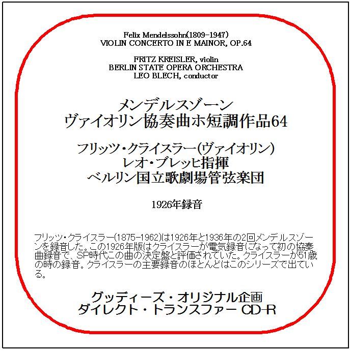 - メンデルスゾーン:ヴァイオリン協奏曲/フリッツ・クライスラー/送料無料/ダイレクト・トランスファー CD-R