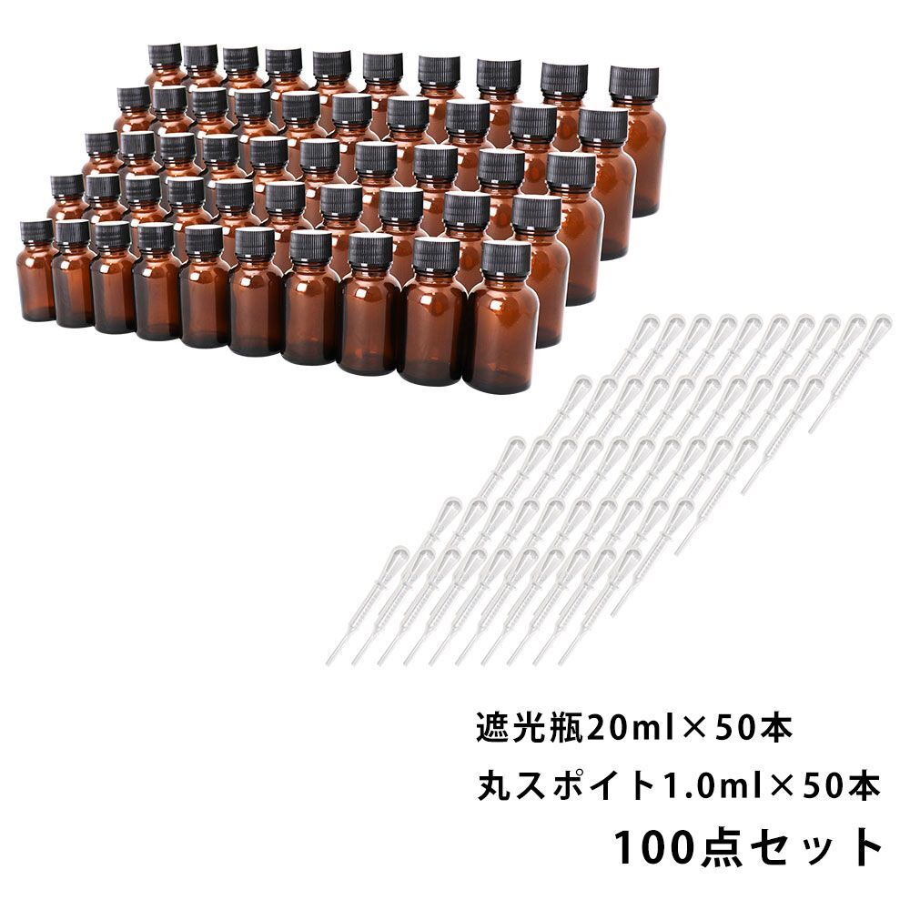 - 送料無料!!遮光瓶 20ml 黒キャップ、ドロッパー付き 50本・丸スポイト 1.0ml 50本 100点セット/スポイト コスメ アロマオイル Z08
