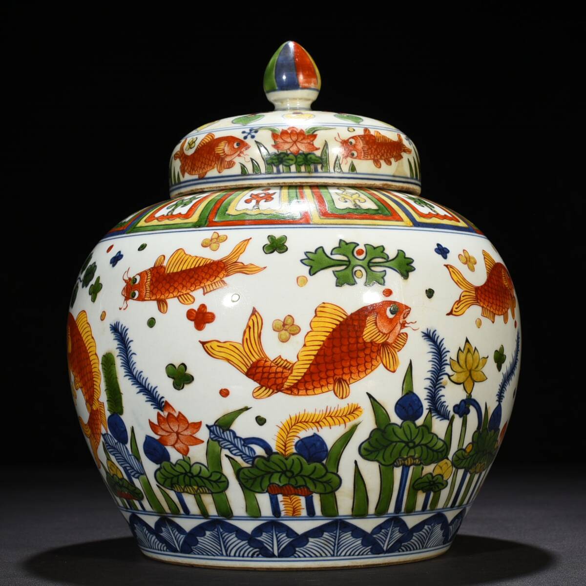 - 時代旧蔵 明時代 嘉靖年製 青花五彩 魚藻紋蓋缶 古陶磁器 高さ29 cm 幅25 cm 珍品旧蔵 古賞物 時代物 818