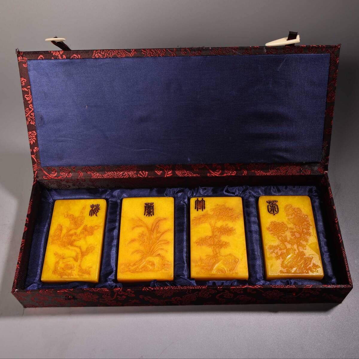 - 蔵友旧蔵出 寿山石 田黄石 細密彫 梅蘭竹菊紋 詩詞賦 令牌一套 箱付 貴重品 稀少物品 置物 賞物 中国時代美術品