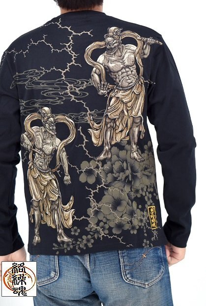 - 粋 仁王雷豪ロングTシャツ◆絡繰魂 B色 XLサイズ 253072 和柄 和風 長袖 刺繍 金剛力士像 阿吽
