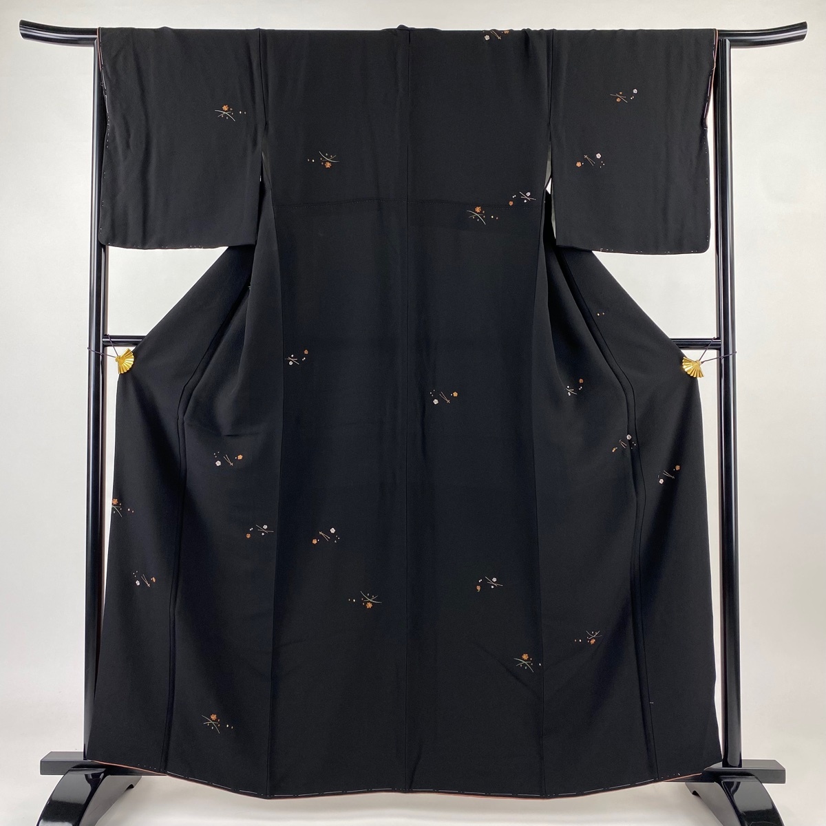 - 小紋 身丈160.5cm 裄丈66.5cm M 袷 吹き寄せ 松梅 刺繍 金糸 黒 正絹 秀品 【中古】