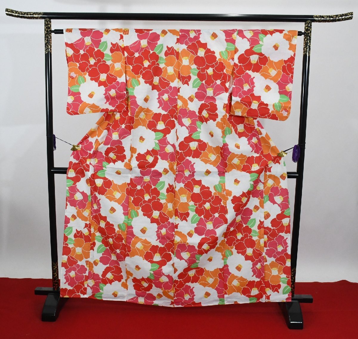- 浴衣 女性用 着物 祭り 夕涼 夏祭り 赤×オレンジ 椿 花火大会 身丈160cm 裄丈65cm ★着物 u-334 桜庭呉服店