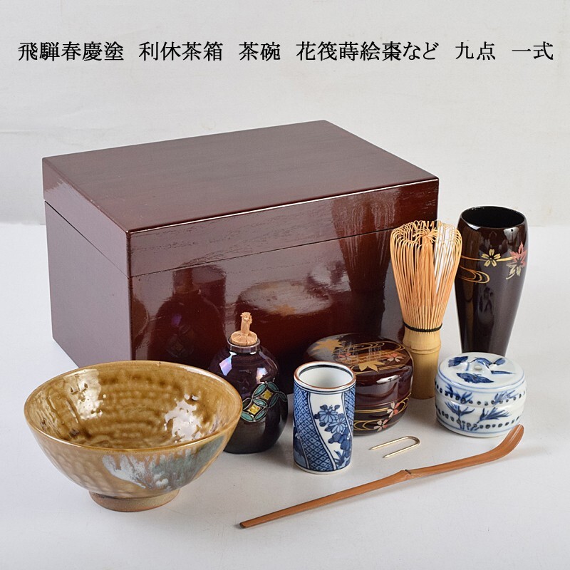 - 茶道具 飛騨春慶塗 利休茶箱 茶碗 花筏蒔絵棗など 九点 一式 MACG