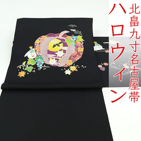 - 和遊館 即決ona4465 北畠 五泉 塩瀬 九寸 名古屋帯 ハロウィン 黒色 お仕立て付き