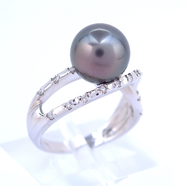 - K14WG ホワイトゴールド リング 指輪 ブラックパール10.400mm ダイヤモンド0.080ct 16号 おしゃれ 人気 鑑別書付【中古】/s01152/10005039