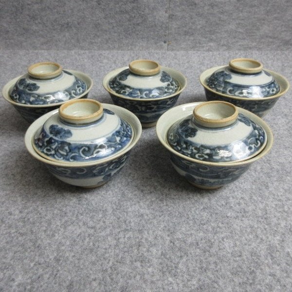- 古犬山 染付 蓋茶碗 5個 [B28564] 高さ8.5cm 直径11.5cm 犬山焼 花唐草 アンティーク 古玩 古美術