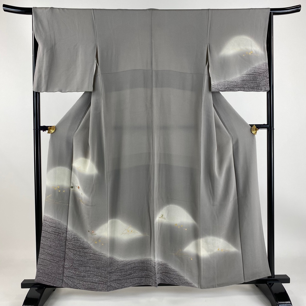 > 訪問着 身丈156.5cm 裄丈65.5cm M 袷 吹き寄せ 波 刺繍 金糸 灰色 正絹 秀品 【中古】