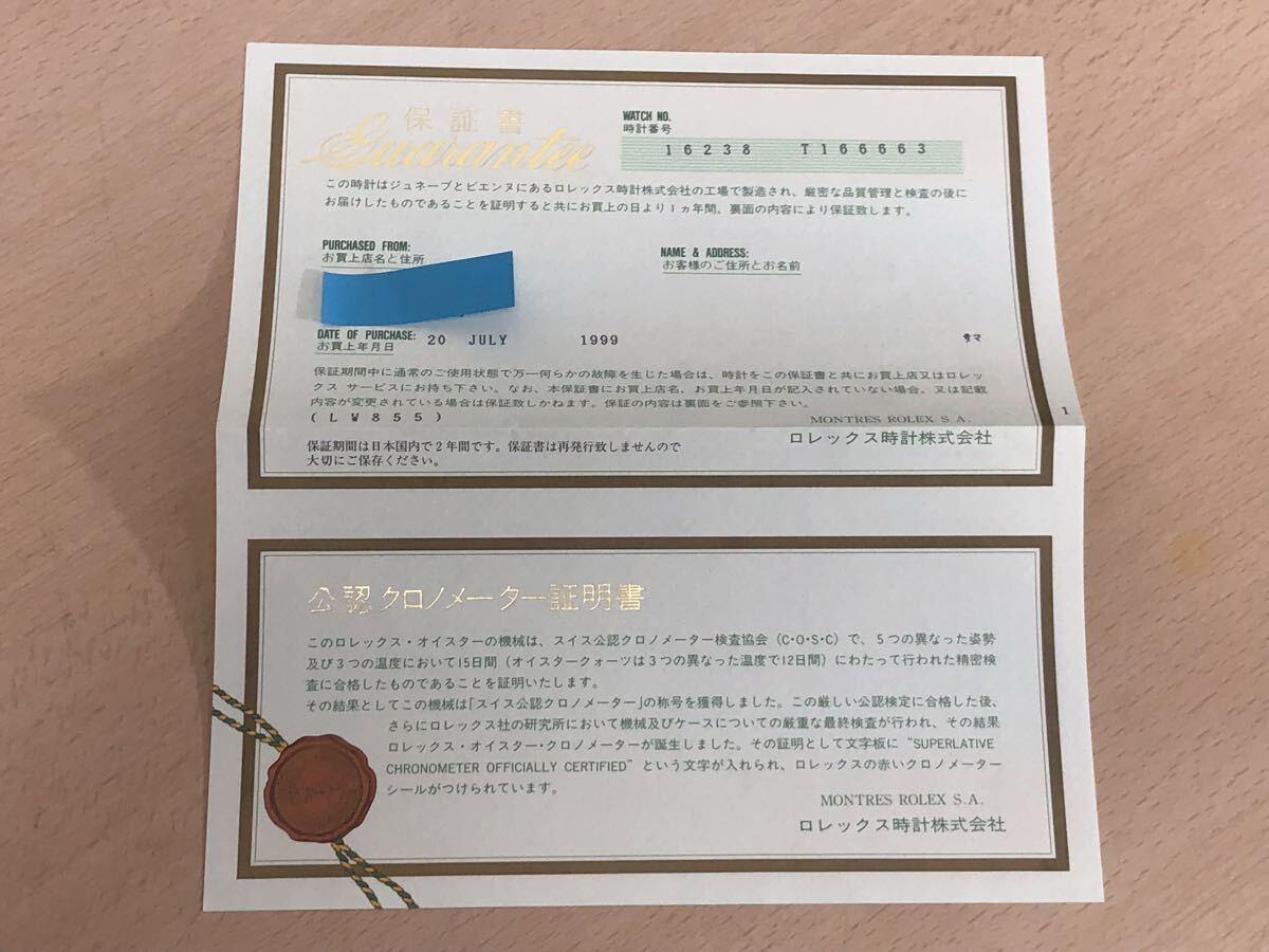 > 【保管品S6973】ROLEX ロレックス 16238 デイトジャスト 保証書 ギャランティ 日本ロレックス株式会社