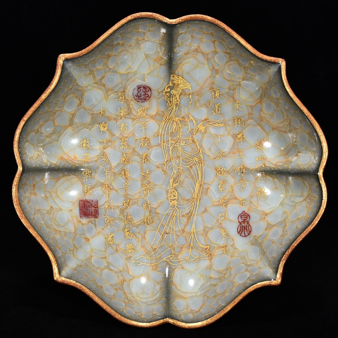 - 宋時代 官窯 氷割れ 包口銘文 金刻 人物四角洗 陶磁器 中国美術 唐物 古美術 置物 高さ7 cm 直径20 cm 823