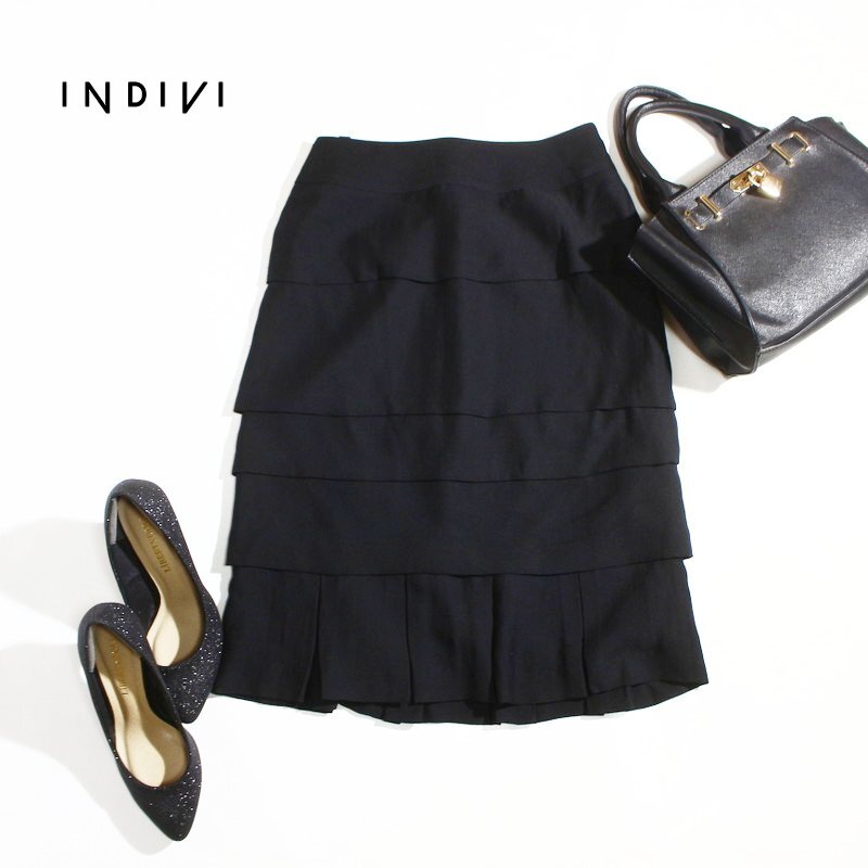 > 美品 インディヴィ INDIVI 株) ワールド 合物 段フリル 綺麗め Aライン スカート 9号 38 ブラック 黒 オフィス 通勤 フォーマル スーツ