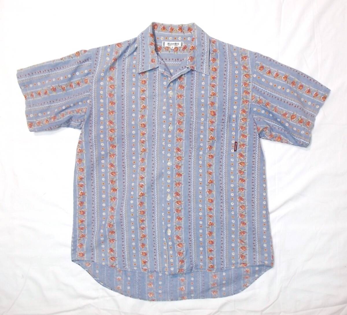 > デニム 半袖シャツ★F(メンズS程度)/綿100%/日本製/ネイビー-ブルー/水色/藤色/小紋/花柄/バラ?ハイビスカス?★アロハシャツ★BIG JOHN