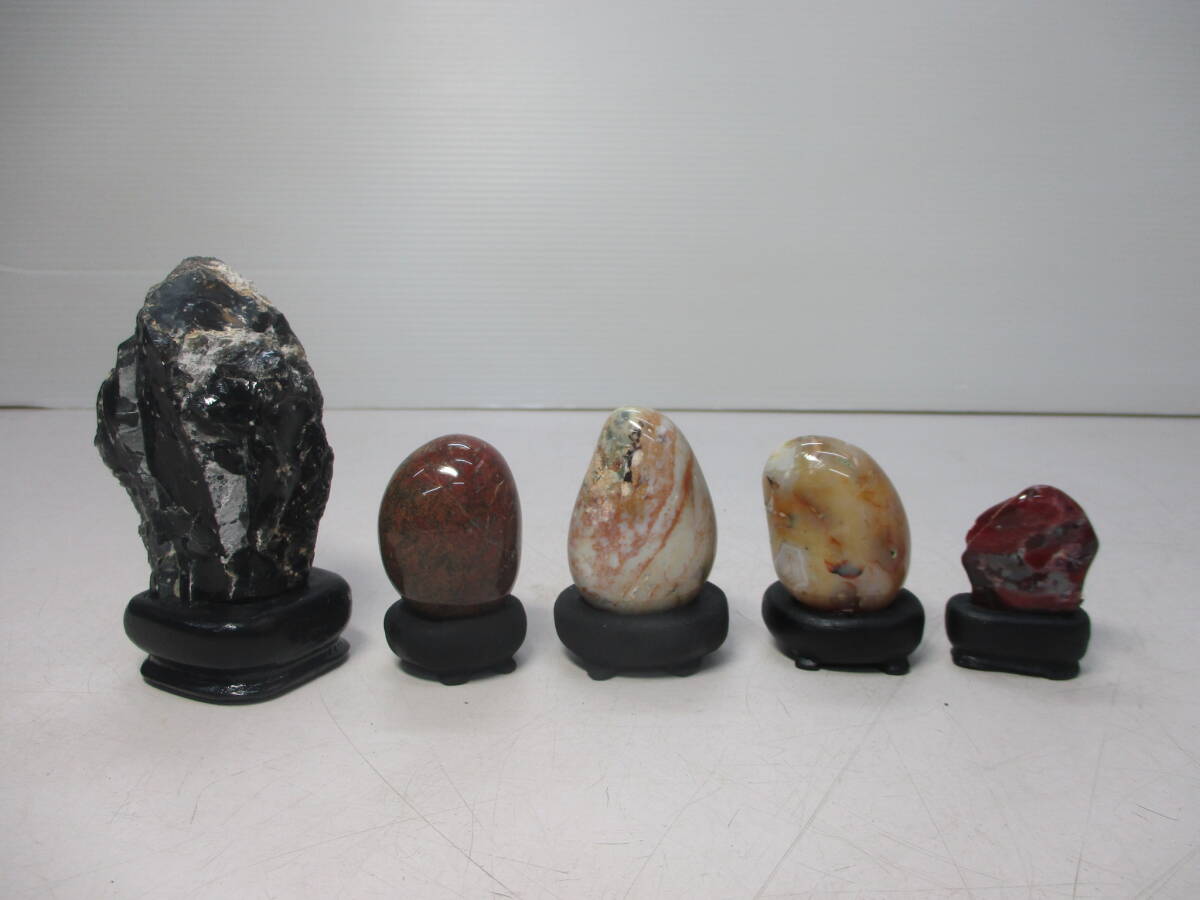 - 津軽 錦石 メノウ/黒曜石 青森県西海岸産 5点セット 計550g 台座付き にしき石 水石 鑑賞石 盆石 自然石 N15