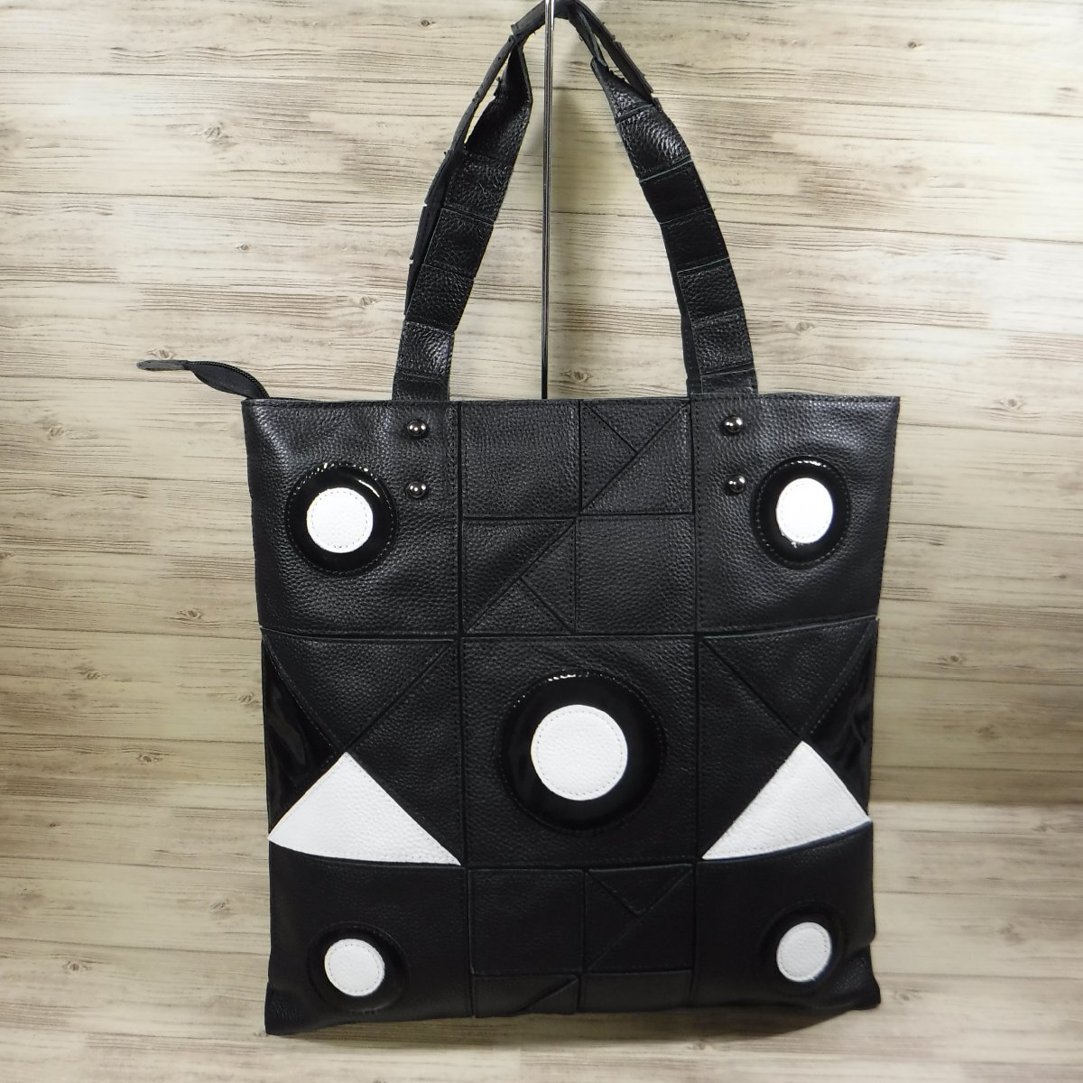 - BB624 センソユニコ t.b 新品 黒 牛革 レザー トートバッグ A4サイズ収納 ドット柄 パッチワーク JIU 慈雨 芽風