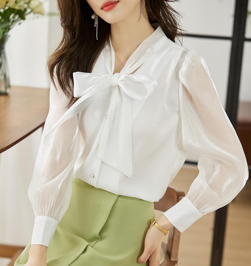 - 人気推薦/エレガント 長袖 サテン ブラウス 高級感 オフィス 通勤 ワイシャツ リボンシャツ 着やせ 大人 可愛い トップス / ホワイト