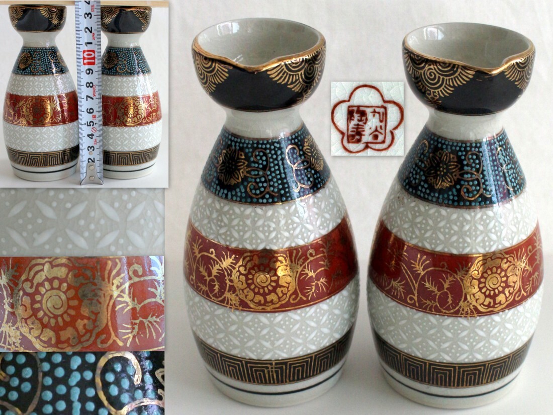 - 1433/中古/九谷焼 九谷陶寿 徳利 2客 ※酒器 青粒鉄仙 白粒 花草文 唐草