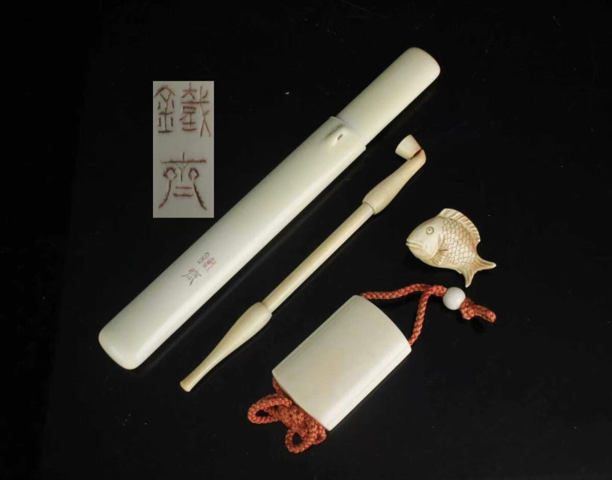- A343 鐵斎 煙草入れ キセル 根付 パイプ 煙管筒 煙管 提げ物 東洋彫刻 天然白材 重96g %=