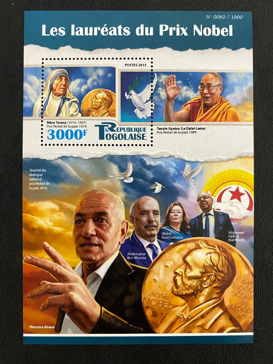 - トーゴ マザー・テレサ ノーベル賞 ダライ・ラマ14世 チュニジア国民対話カルテット 小型シート1種完 未使用 NH
